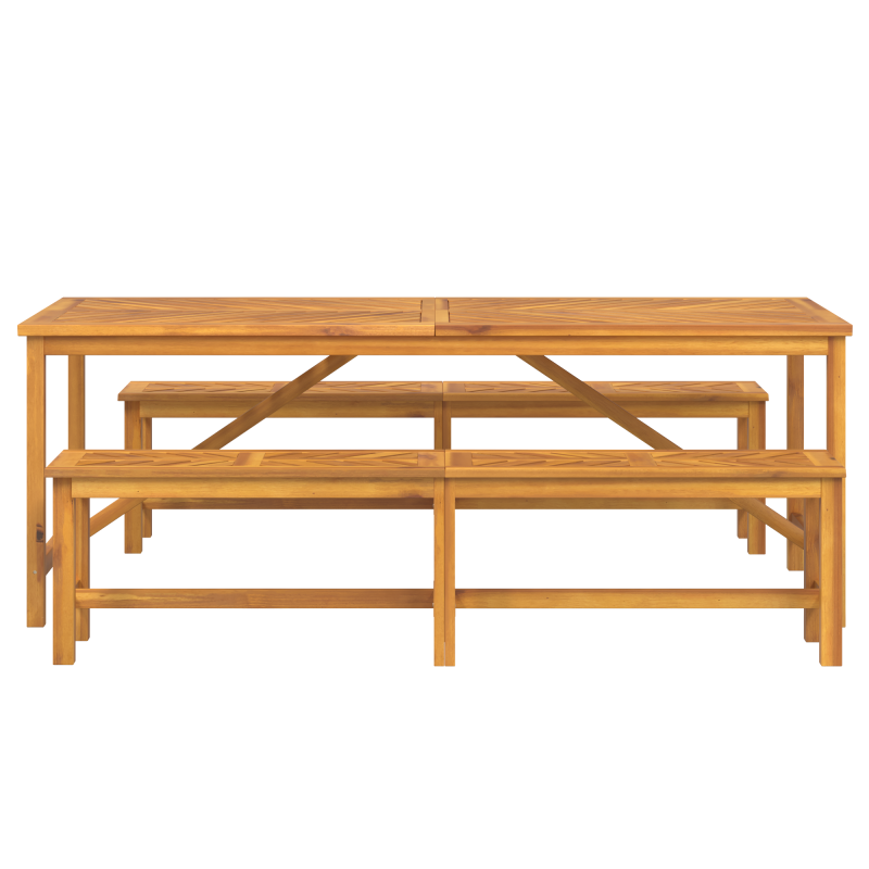 Diese Garten Essgruppe kombiniert Praktikabilität mit rustikalem Charme und ist eine richtig coole Ergänzung für deine Terrasse oder deinen Balkon. Hergestellt aus solidem Akazienholz, hast du einen rechteckigen Tisch und zwei geräumige Bänke – perfekt für ein gemütliches Essen oder Zeit mit Freunden und Familie. Langlebiges Material: Hergestellt aus solidem Akazienholz, ist dieses Set bereit für den Außenbereich und sieht dabei immer noch top aus. Charmantes Design: Der rustikale Stil und die glatte Oberfläche schaffen eine warme, einladende Atmosphäre für jeden Außenbereich. Bequeme Sitzgelegenheiten: Mit Platz für 6 Leute kannst du entspannt zusammen speisen. Geöltes Finish: Das natürliche Ölfinish hebt die Schönheit des Holzes hervor und schützt gegen Feuchtigkeit. Vielseitige Nutzung: Ideal für draußen Essen, Grillpartys oder einfach zum Relaxen in der Sonne.