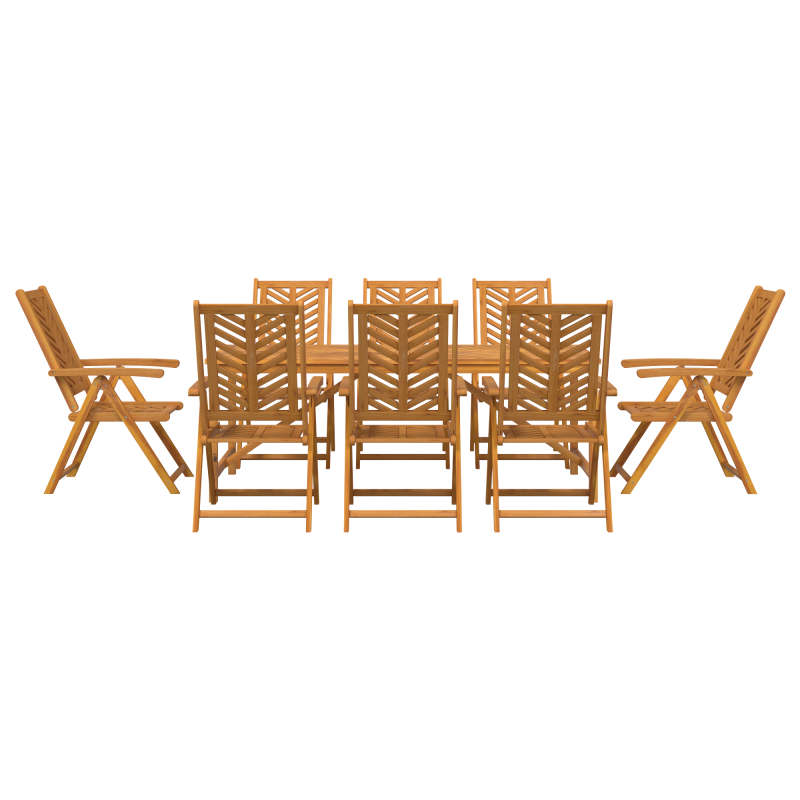 Das große Garten Esstisch Set ist aus solidem Akazienholz gefertigt, hat eine glatte Haptik und ein reichhaltiges, natürliches Finish, das dein Essen im Freien aufwertet. Ideal für geräumige Terrassen, Gärten oder große Balkone, bietet das Set einen praktischen Essbereich und bringt rustikalen Charme in deinen Außenbereich. Robuste Konstruktion: Der massive Holzrahmen ist für die Ewigkeit gebaut und hält draußen gut stand. Komfortables Design: Die Stühle sind bequem und bieten eine gute Sitz-Tiefe sowie ergonomische Rückenlehnen für entspannte Zeiten. Platzsparend: Das klappbare Feature ermöglicht einfache Lagerung, wenn es nicht gebraucht wird, ideal für größere Außenbereiche. Großzügige Sitzgelegenheiten: Bietet problemlos Platz für bis zu 8 Personen bei Familienfeiern oder Abendessen mit Freunden. Wetterfest: Behandelt, um UV- und Wasserbeständigkeit zu bieten, damit es länger draußen hält.