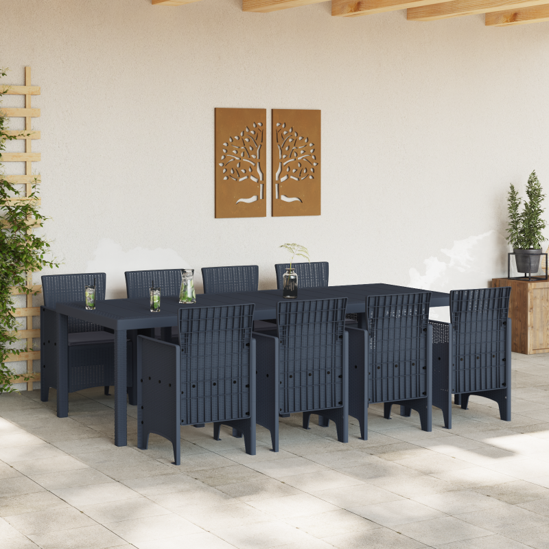 Das 9-teilige Garten-Essset mit Kissen verbindet Stil und Funktionalität, ideal für kleine Zusammenkünfte oder größere Events draußen. Es bietet einen schicken rechteckigen Tisch und acht bequeme, gepolsterte Stühle, die eine super Ergänzung für deinen Balkon oder deine Terrasse sind und das Aussehen deines Außenbereichs aufpeppen. Ergonomisches Design: Durchdachte Stühle für ein bequemes Erlebnis beim Essen oder einfach beim Chillen mit Freunden. UV-beständiges Material: Hergestellt aus qualitativ hochwertigem Polyethylen-Rattan, ist dieses Set gemacht, um UV-Strahlen zu widerstehen und sorgt dafür, dass es lange hält, ohne zu verblassen. Vielseitige Nutzung: Funktioniert super für drinnen und draußen, ideal für deine saisonalen Zusammenkünfte. Stylische Ästhetik: Mit einem modernen matten Finish sieht dieses Set nicht nur gut aus, sondern funktioniert auch und bringt einen trendigen Touch in deinen Essbereich. Pflegeleicht: Die Kissen lassen sich einfach abziehen für eine einfache Reinigung, und die glatten Oberflächen erleichtern die Pflege, sodass dein Set immer top aussieht.